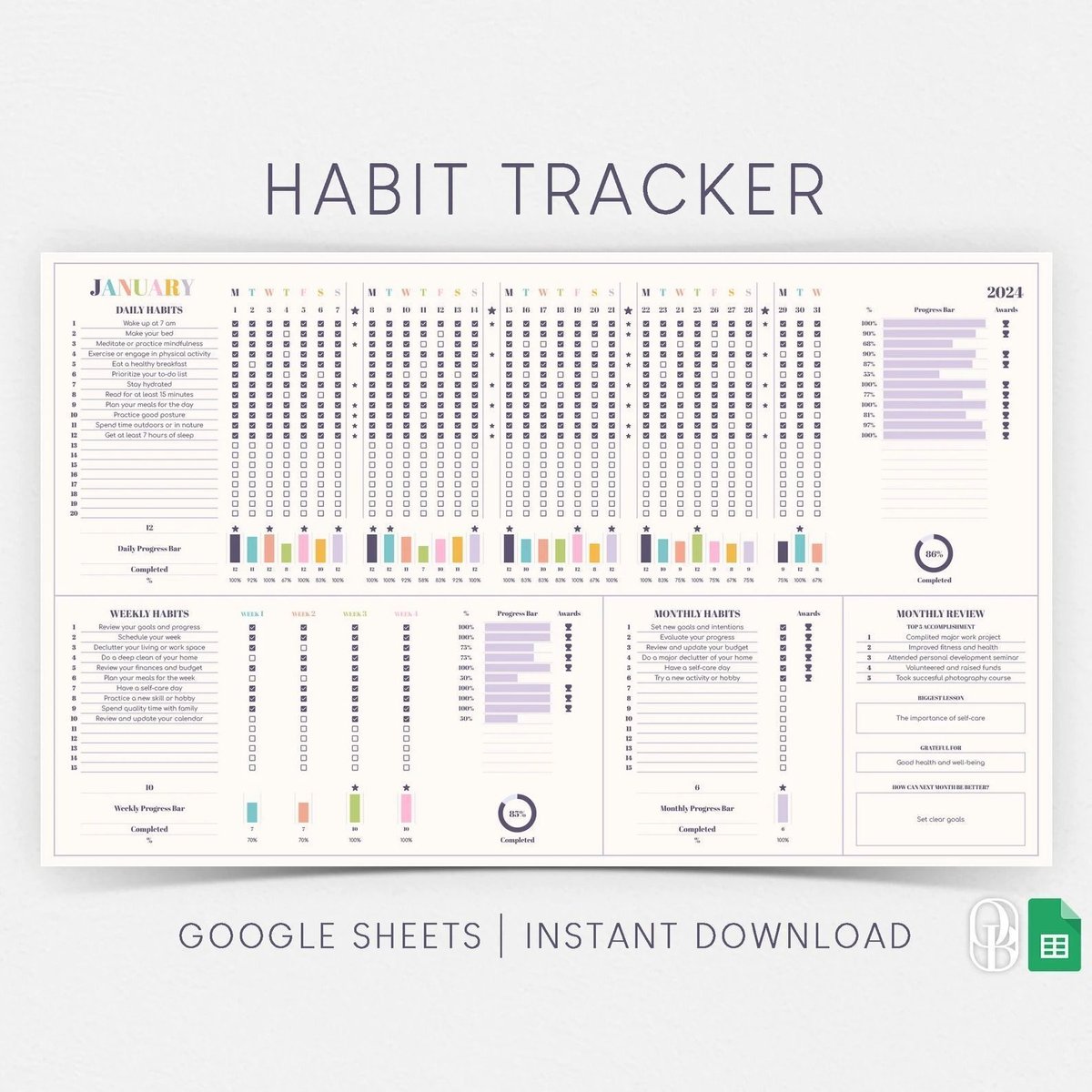 - What It Is: An interactive spreadsheet that visually tracks your daily habits, marking what you have accomplished.